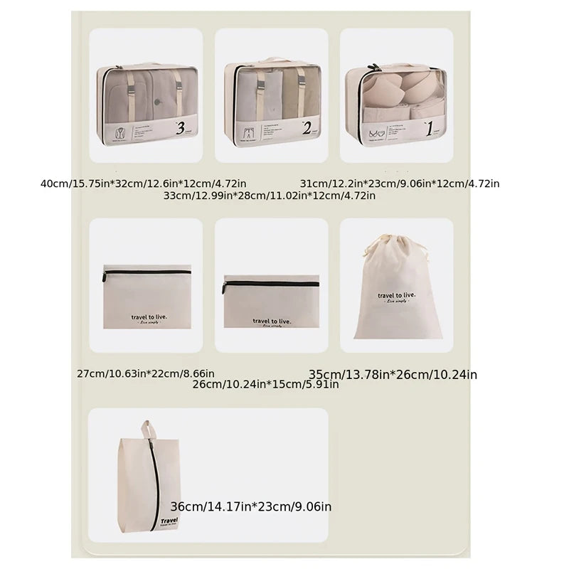 Includes: Garment cubes, underwear pouch, cosmetic bag, drawstring bag, flat pouch