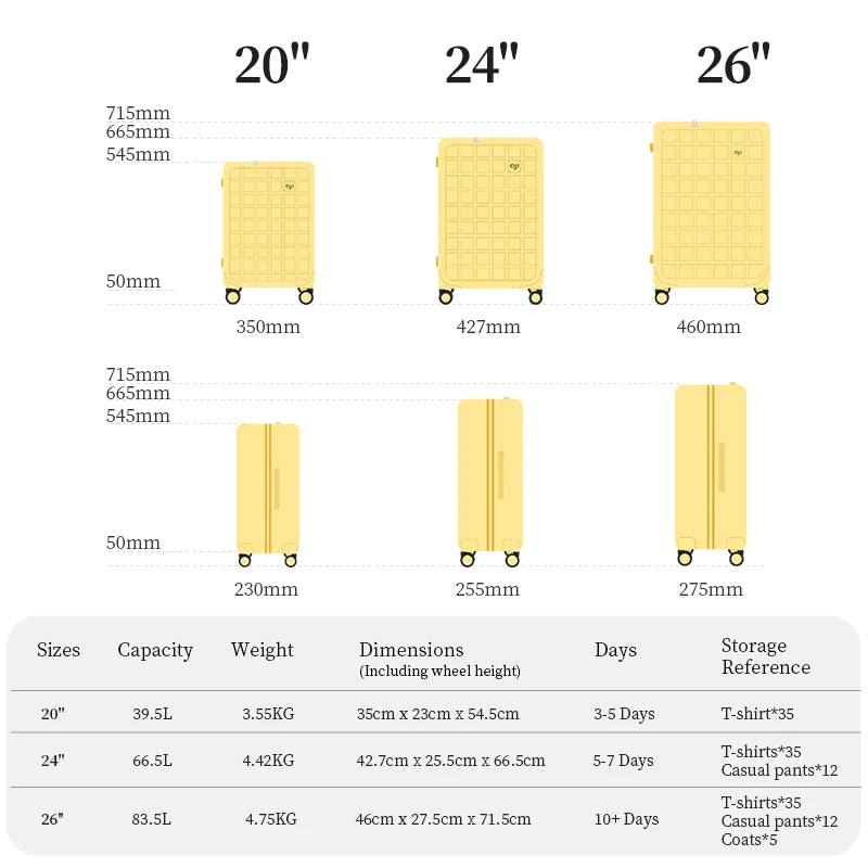 Available in 20", 24", and 26", the Soleil embodies Voyan Maison’s vision of travel as beauty in motion.