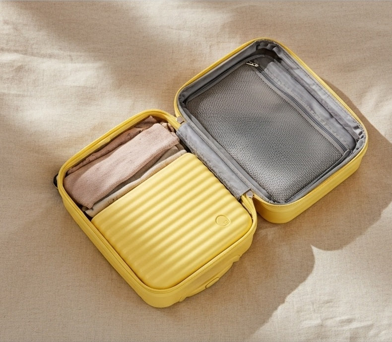 The Voyan Céleste Cabin captures the essence of refined travel in a compact form. Crafted from lightweight hardshell polycarbonate, this 14-inch case combines durability, elegance, and convenience. Designed to meet all airline cabin requirements, it moves effortlessly with silent 360° spinner wheels and secures belongings under a TSA-approved lock.